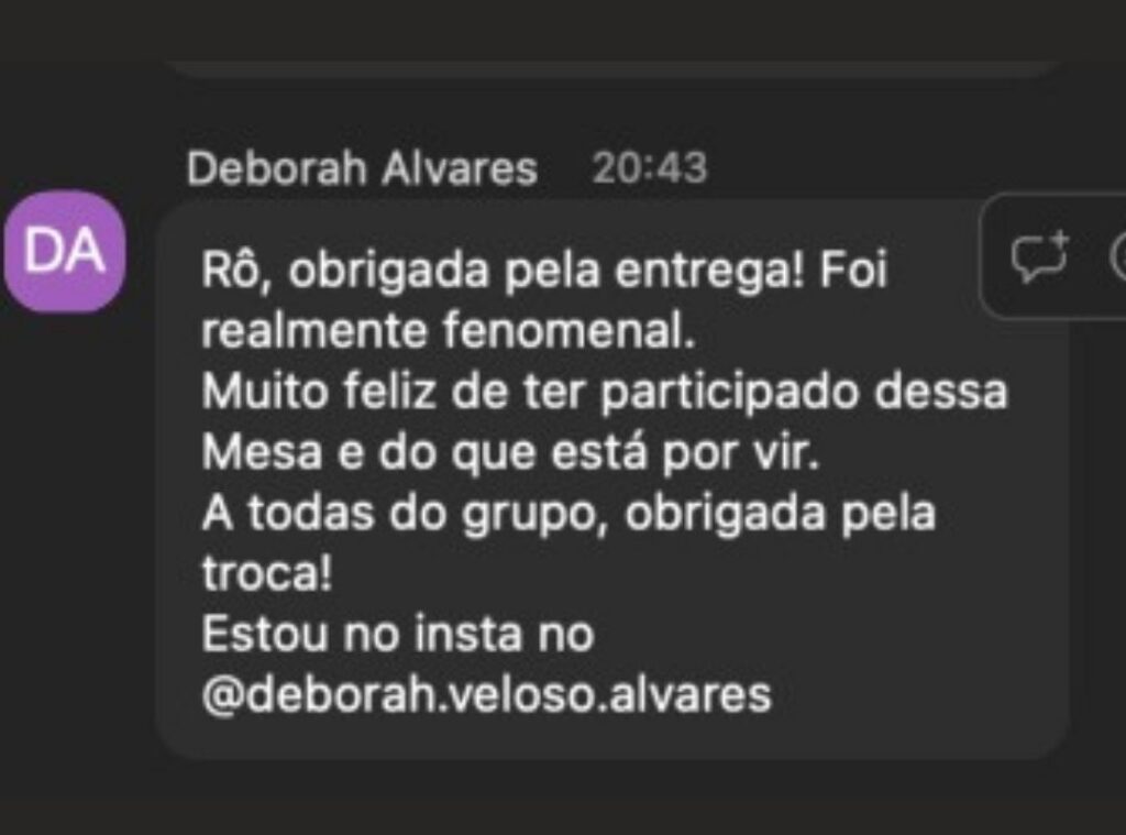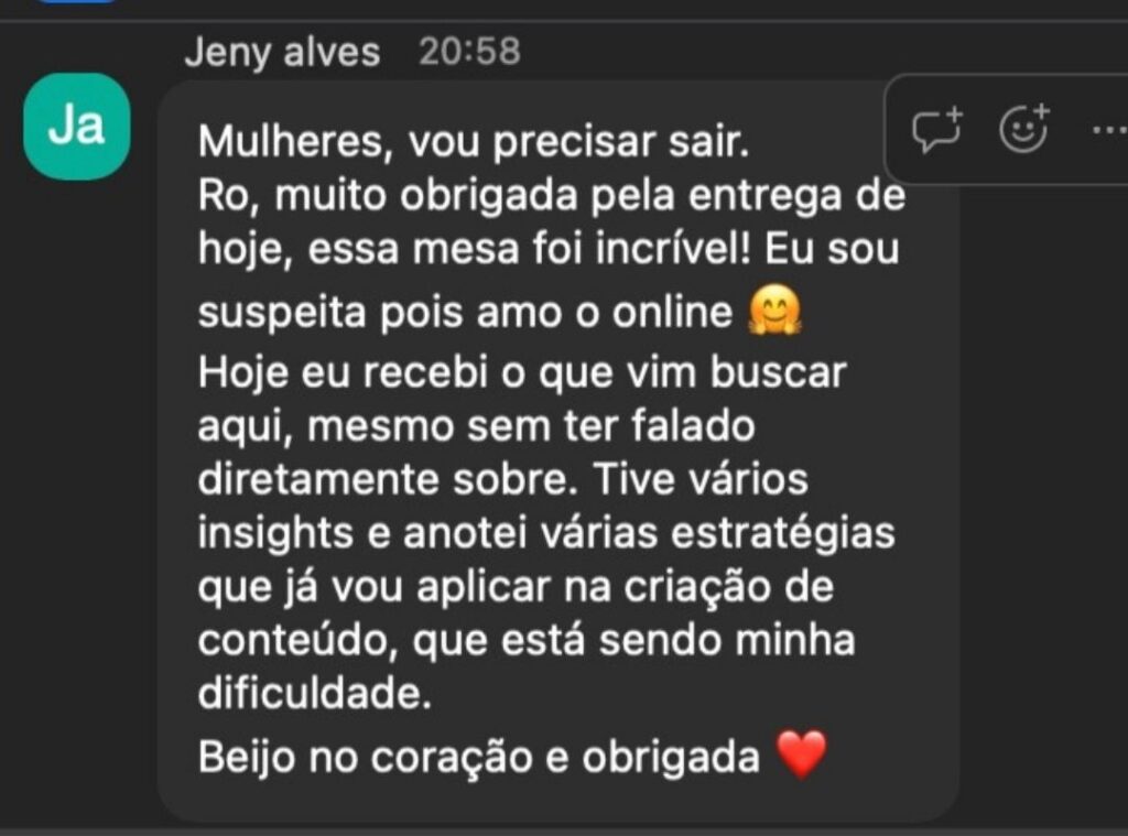 A Mesa W Online é em grupo, mas cada participante recebe um olhar individualizado. Roberta conduz de forma que cada mulher seja vista, escutada e receba orientações específicas sobre o seu momento e negócio.